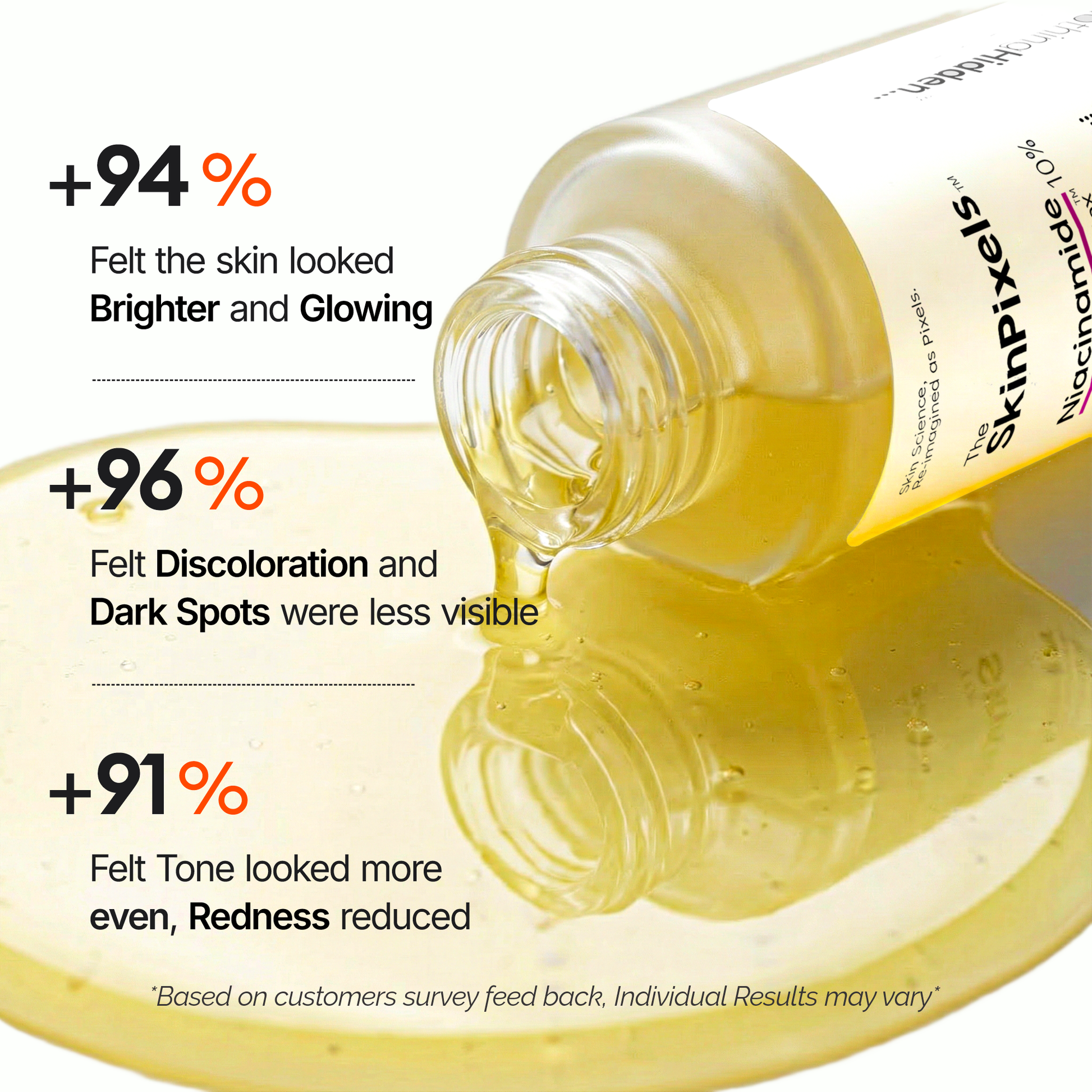 Based on a consumer evaluation, participants reported visible improvements in discoloration, dark spots, redness, and overall skin tone with regular use.